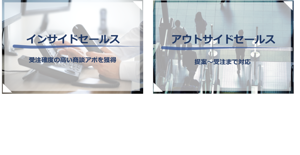 インサイドセールスによるリード・商談獲得や顧客育成、フィールドセールスによる提案・クロージングまで、貴社の営業活動を支援します。